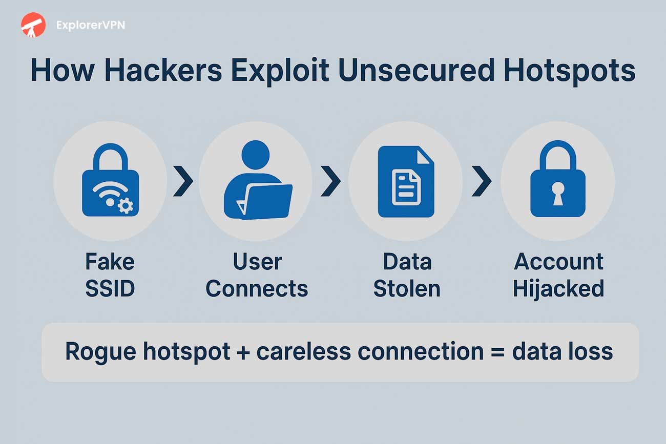 Hackers exploit unsecured hotspots through data interception, rogue networks, credential theft, session hijacking, network manipulation, and traffic analysis.
